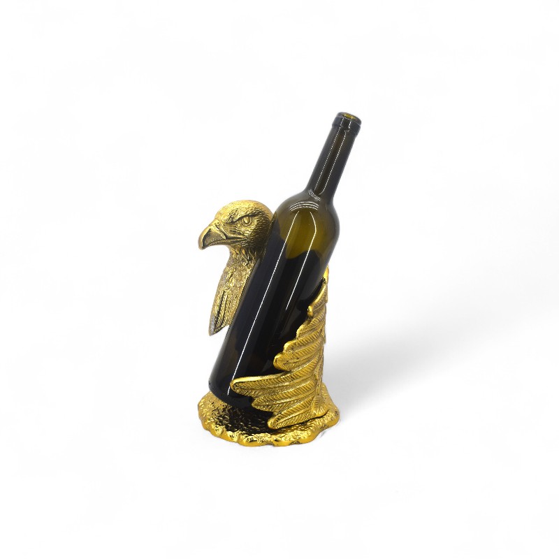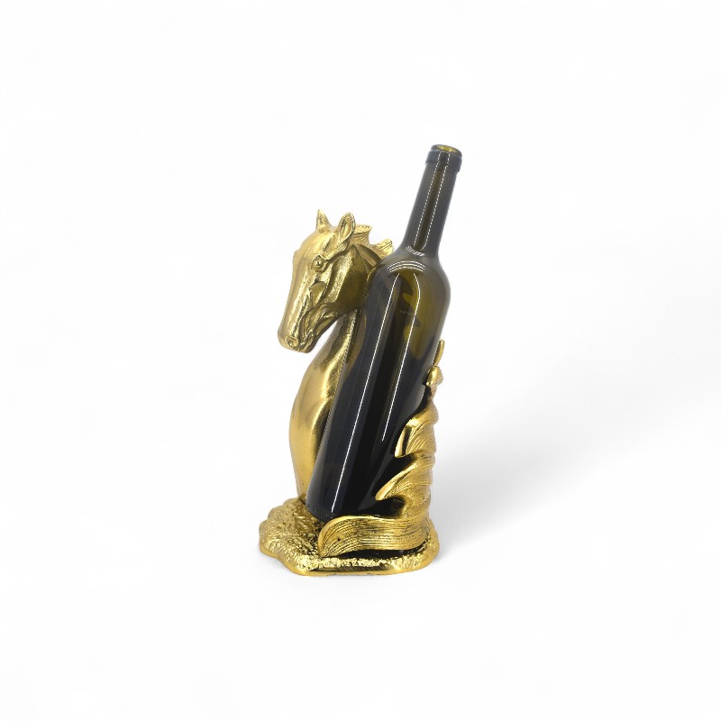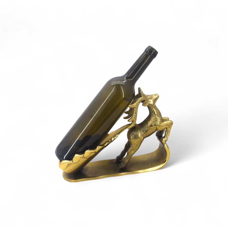 A decorative wine bottle holder crafted from antique brass. The stand features a leaping deer sculpture as its main support. The base of the holder is designed to cradle a wine bottle at an angle, making it both a functional item and a stylish piece of decor. The finish is a burnished, vintage gold color.