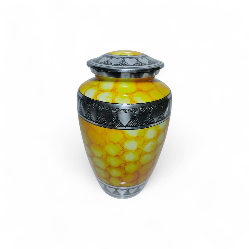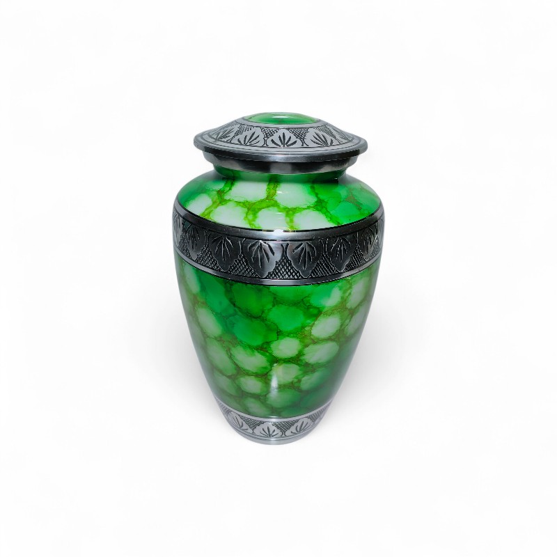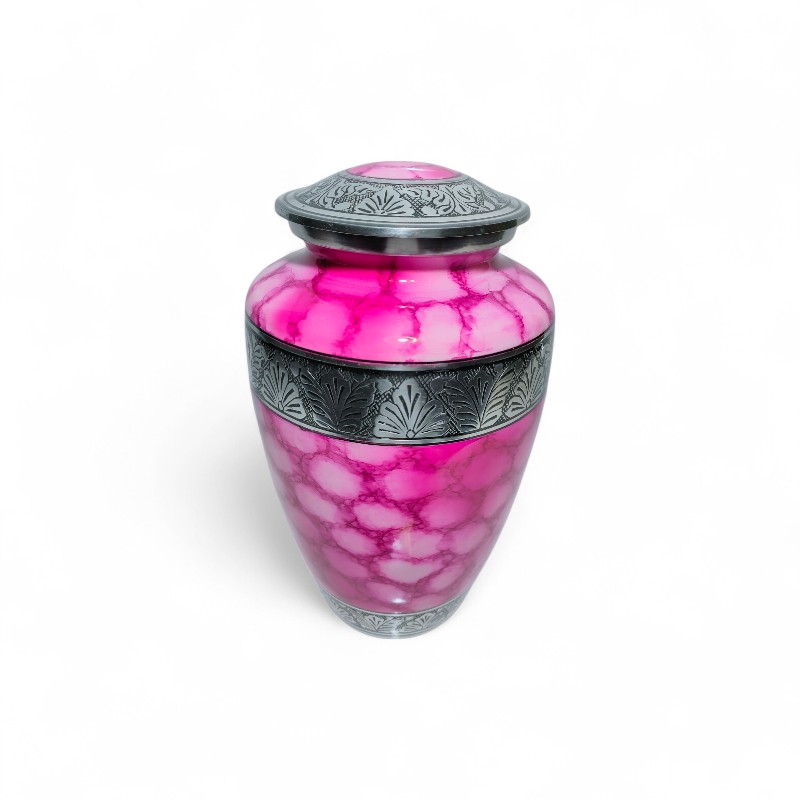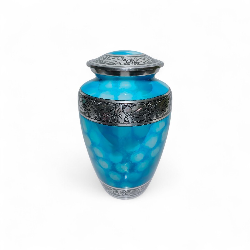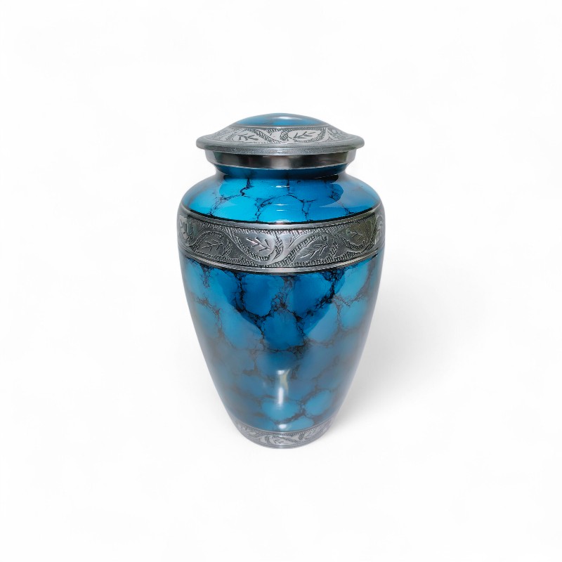 A cremation urn with a vibrant, polished blue finish featuring a marbled or cloud-like white pattern. The urn is bordered on the top and bottom by pewter or silver-toned metal bands with an engraved floral or leaf pattern. The matching lid also has a similar intricate design.