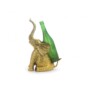 A decorative wine bottle holder featuring a sitting elephant with its trunk raised. The piece has a vintage or antique brass finish with a textured, detailed surface. The elephant is designed to cradle a wine bottle on its back, holding it at an upward angle.