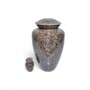 A cremation urn set that includes a full-size urn and a small keepsake urn. Both pieces have a speckled pattern of gold, brown, and off-white tones, giving them a granite-like or textured appearance. The urns have a polished finish and are accompanied by matching lids.