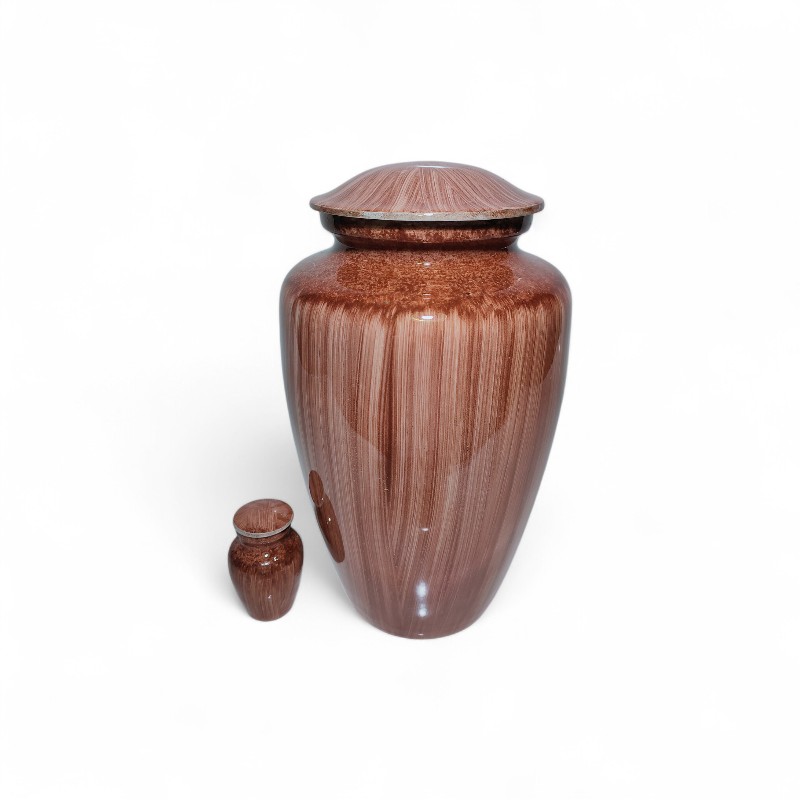A cremation urn set consisting of one full-size urn and one small keepsake urn. Both pieces feature a rich, glossy brown finish with a vertical streaked or woodgrain-like pattern. The urns have a classic, tapered shape and come with matching lids.