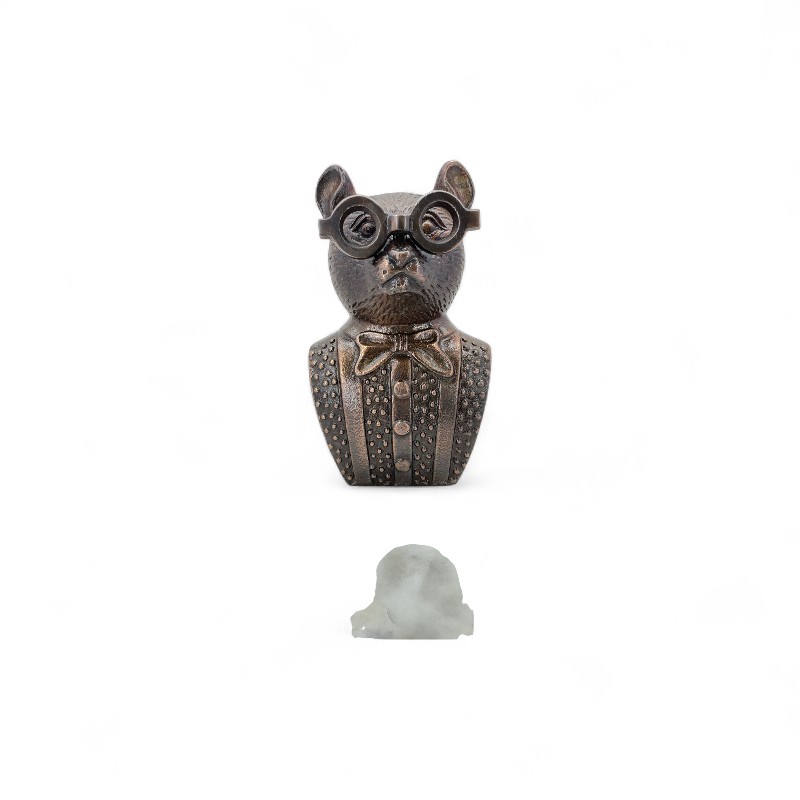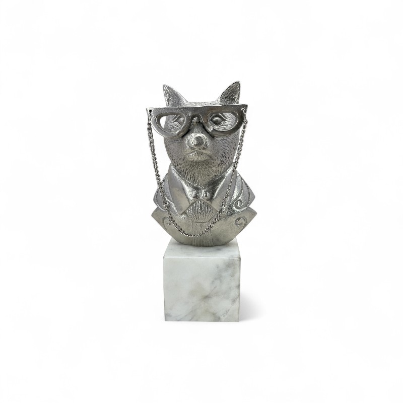 A decorative, silver-colored bust of a fox dressed in a jacket, wearing large glasses with a chain, mounted on a white marble cube.