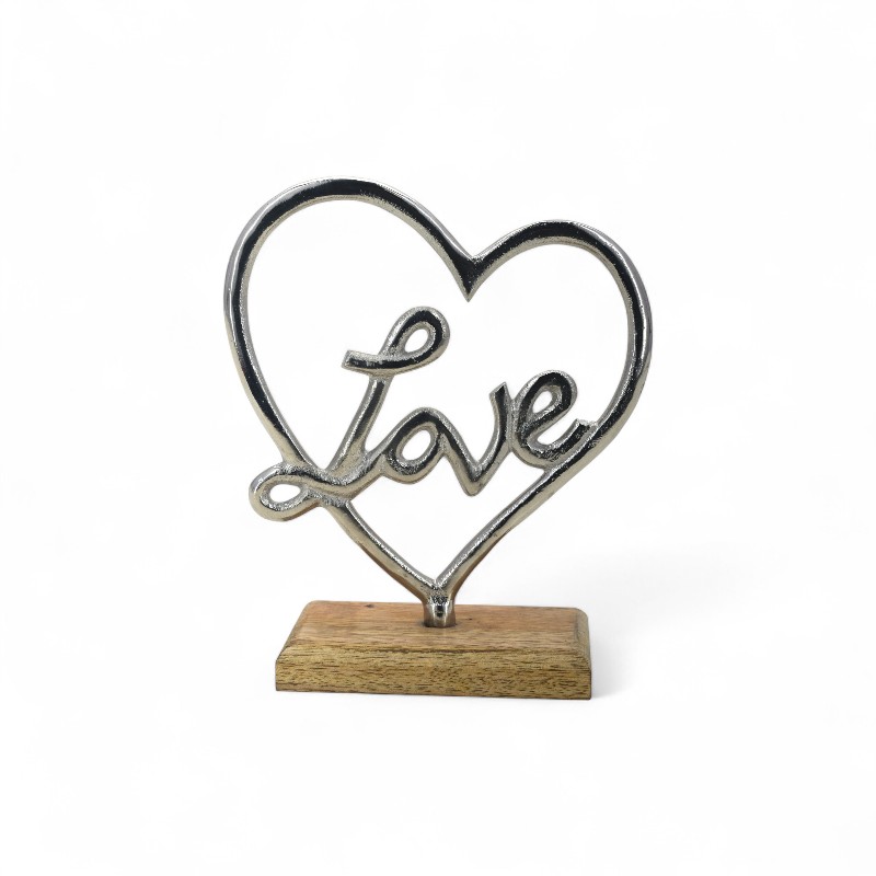 A decorative, metallic silver sculpture featuring the word “Love” in script font, enclosed within a heart shape. It is mounted on a small, rectangular wooden base.