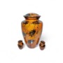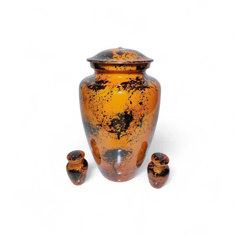 A cremation urn set consisting of one large urn and two small keepsake urns. All three pieces have a glossy orange finish with a spatter or speckled pattern of black and darker tones. The urns have a classic, tapered shape and come with matching lids.