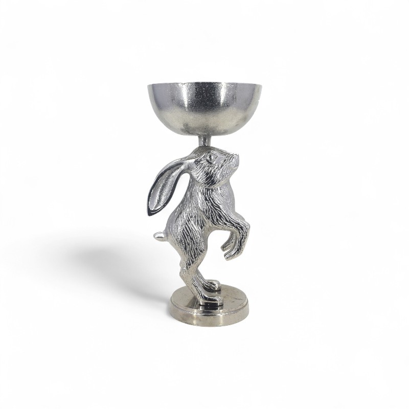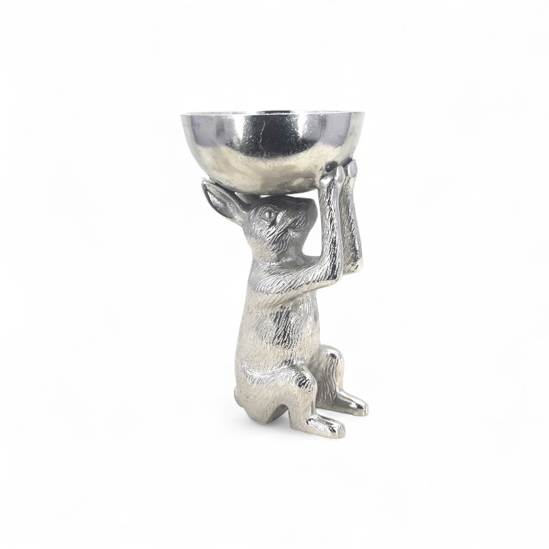 A decorative, silver-colored stand featuring a rabbit standing on its hind legs holding a small bowl or goblet.