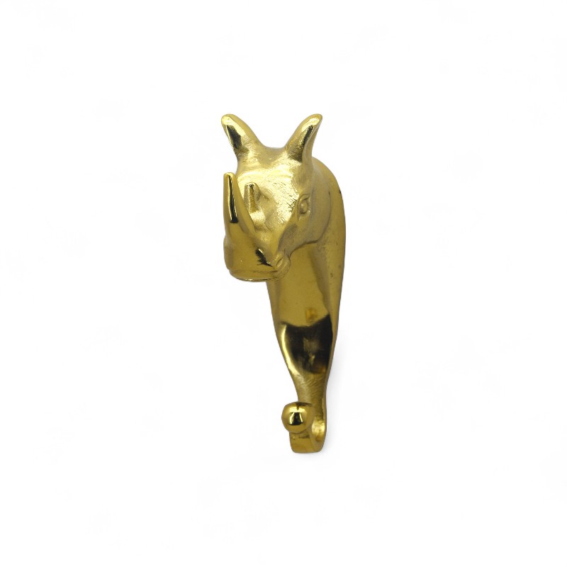 This is a decorative wall hook made of brass or a gold-toned metal, shaped like a rhinoceros head. The design features a prominent horn, a textured head, and small ears. The functional hook extends from the bottom of the rhino’s chin. The item has a smooth, shiny finish and is photographed on a white background.