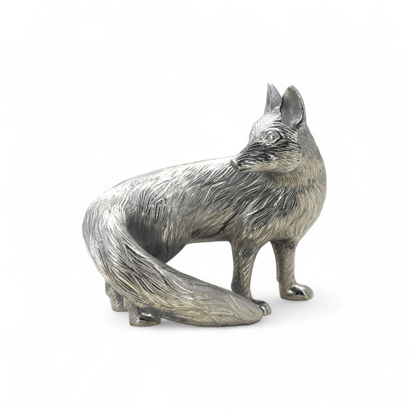 A decorative, silver-colored figurine of a fox with detailed fur texture, looking over its shoulder.