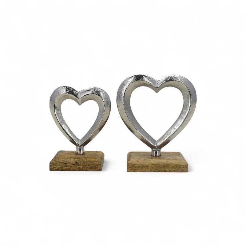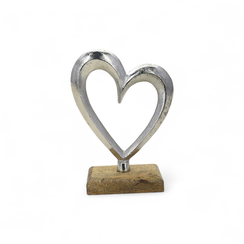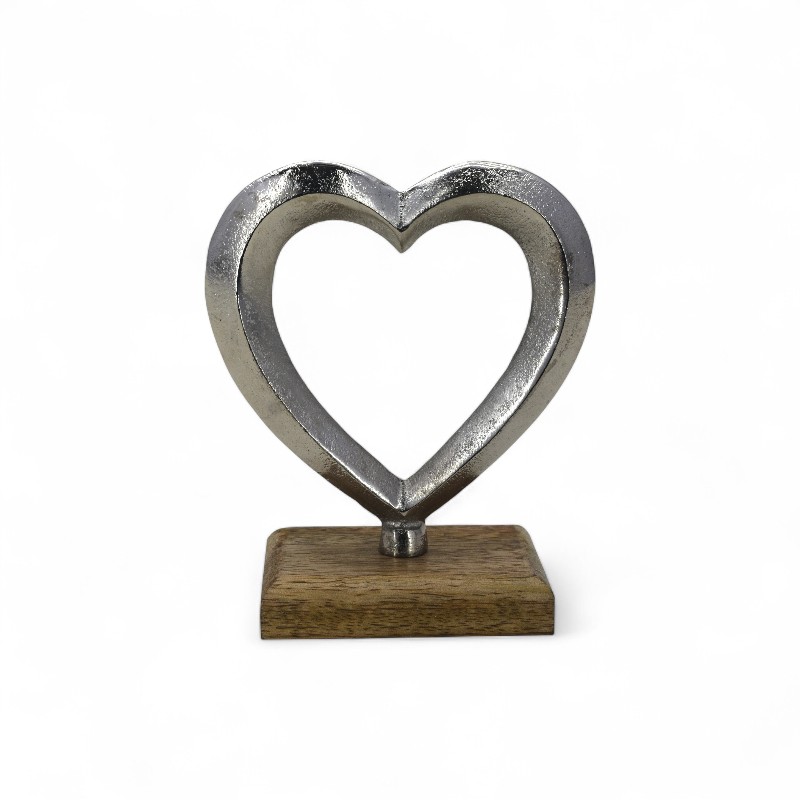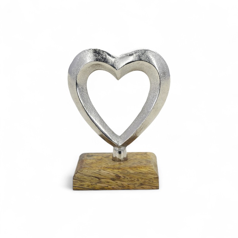 A decorative, metallic silver open heart sculpture mounted on a small, rectangular wooden base. It serves as a simple and elegant accent piece.