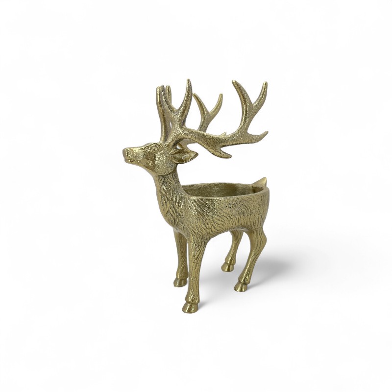 A decorative, golden metallic figurine of a standing deer with large antlers. Its body is hollowed out to form a small bowl or planter, making it a unique and functional accent piece.