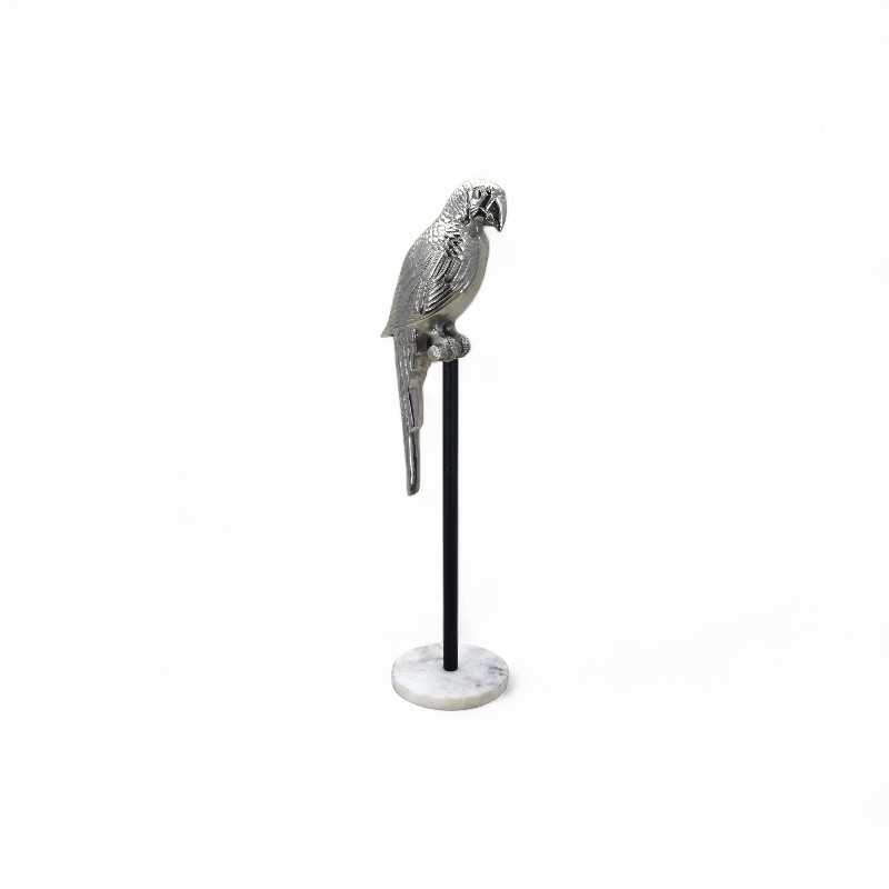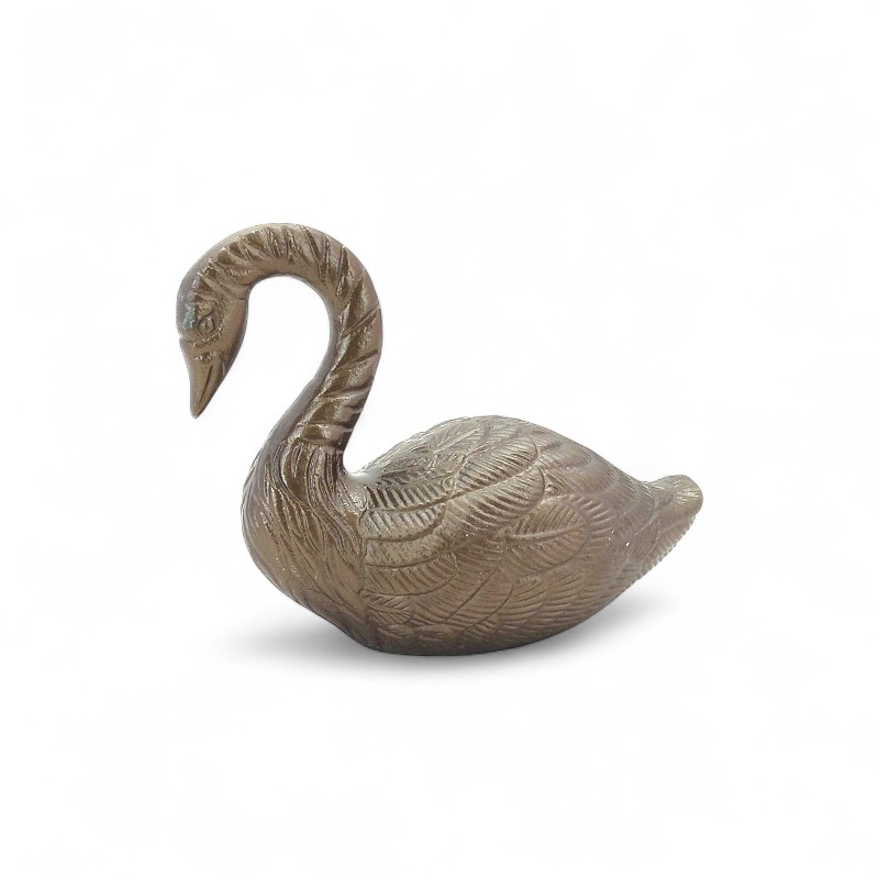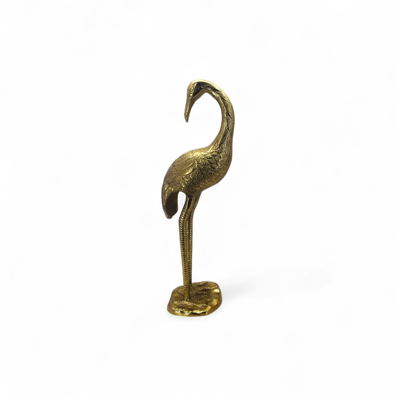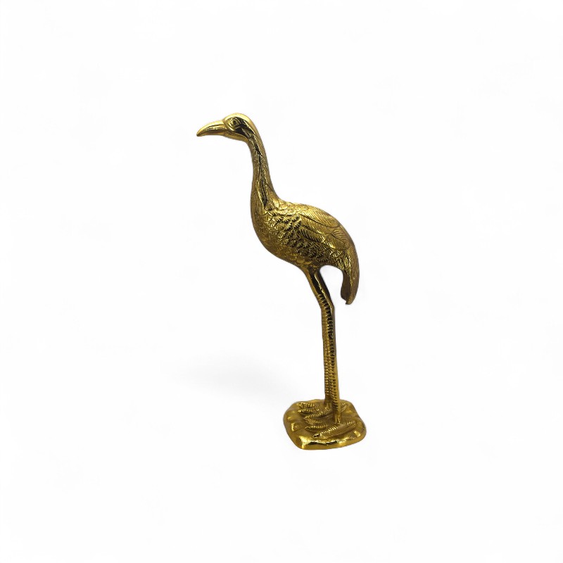 A decorative, golden-colored figurine of a crane or heron standing on a small base.