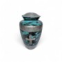 A cremation urn with a striking, marbled pattern in shades of teal, blue, and black. The urn features a pewter or silver-toned cross emblem on the front. The top and bottom bands, as well as the matching lid, are also made of the same silver-toned metal with an engraved floral or leaf pattern.