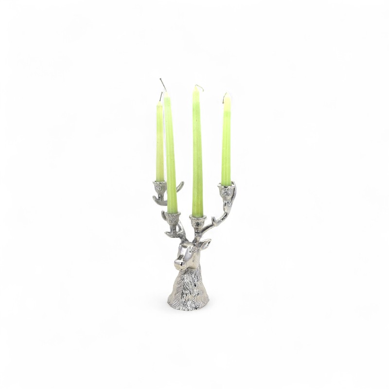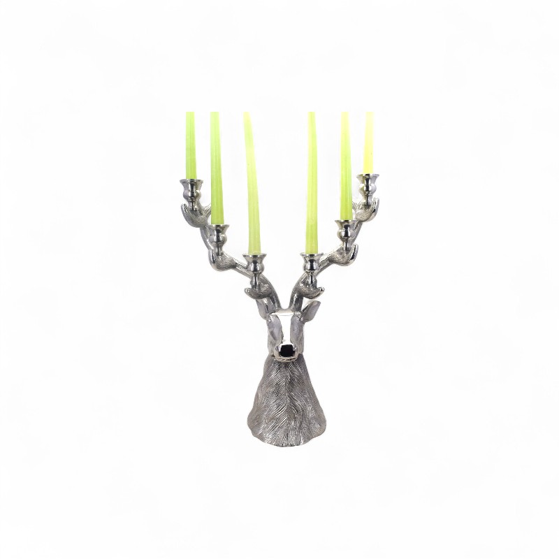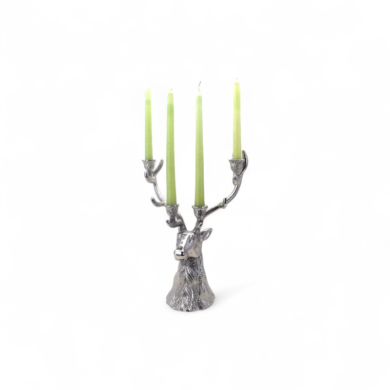 A striking four-light candelabra with a sleek silver finish. The design features a majestic stag with antlers that gracefully hold the candles, making it a perfect centerpiece for any table.