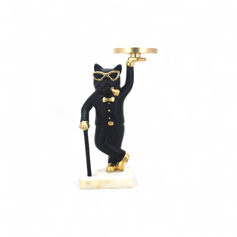 A quirky and stylish two-light candelabra featuring a bulldog dressed in a tuxedo and sunglasses, holding a candle in each hand. The playful design is finished in black and gold on a marble base, adding a touch of bold personality to your decor.