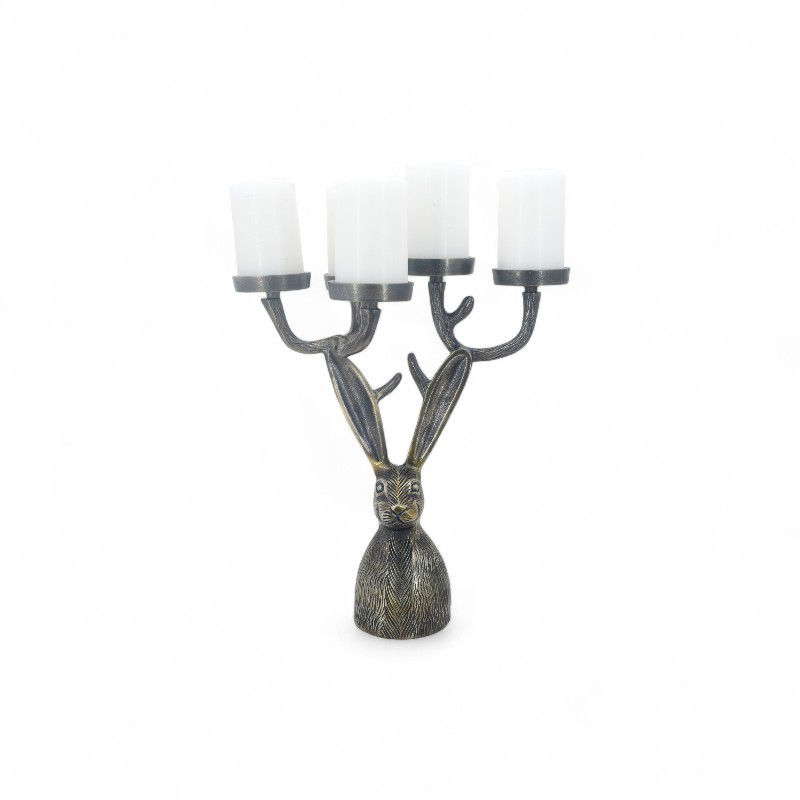 A whimsical candelabra featuring a detailed hare, with antlers that gracefully hold four glowing candles. A unique blend of woodland fantasy and elegant home decor.