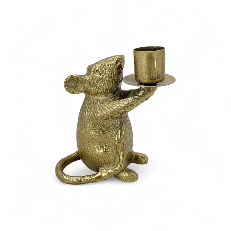 A charming and whimsical candle holder featuring a detailed mouse holding a candle cup above its head. The antique golden finish adds a touch of rustic charm to this delightful and unique decor piece.