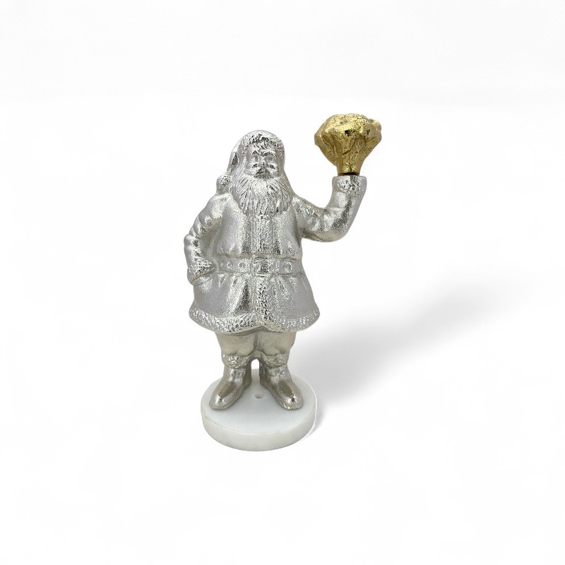 A festive and charming candle holder featuring a classic Santa figure in a shimmering silver finish. He holds a golden candle cup, making it a perfect decorative piece for adding holiday cheer to your home.